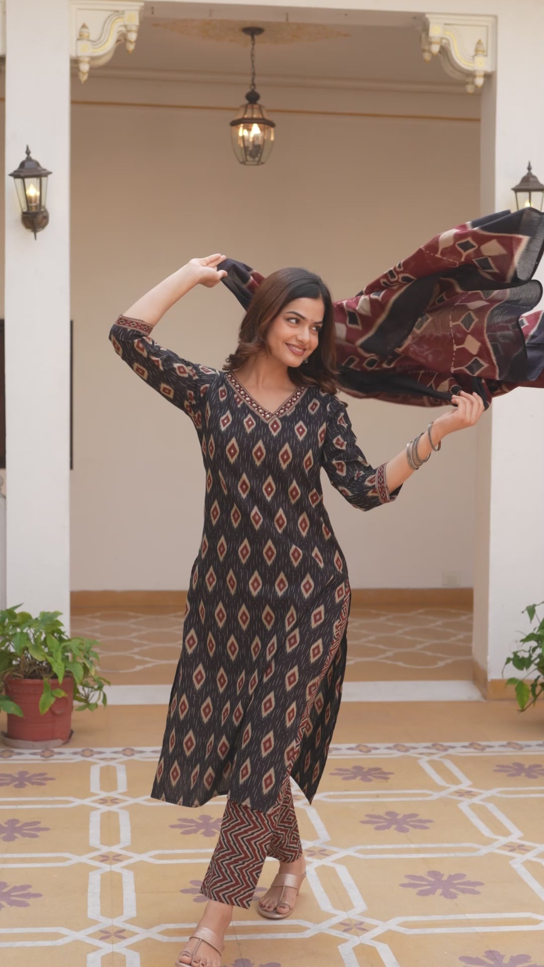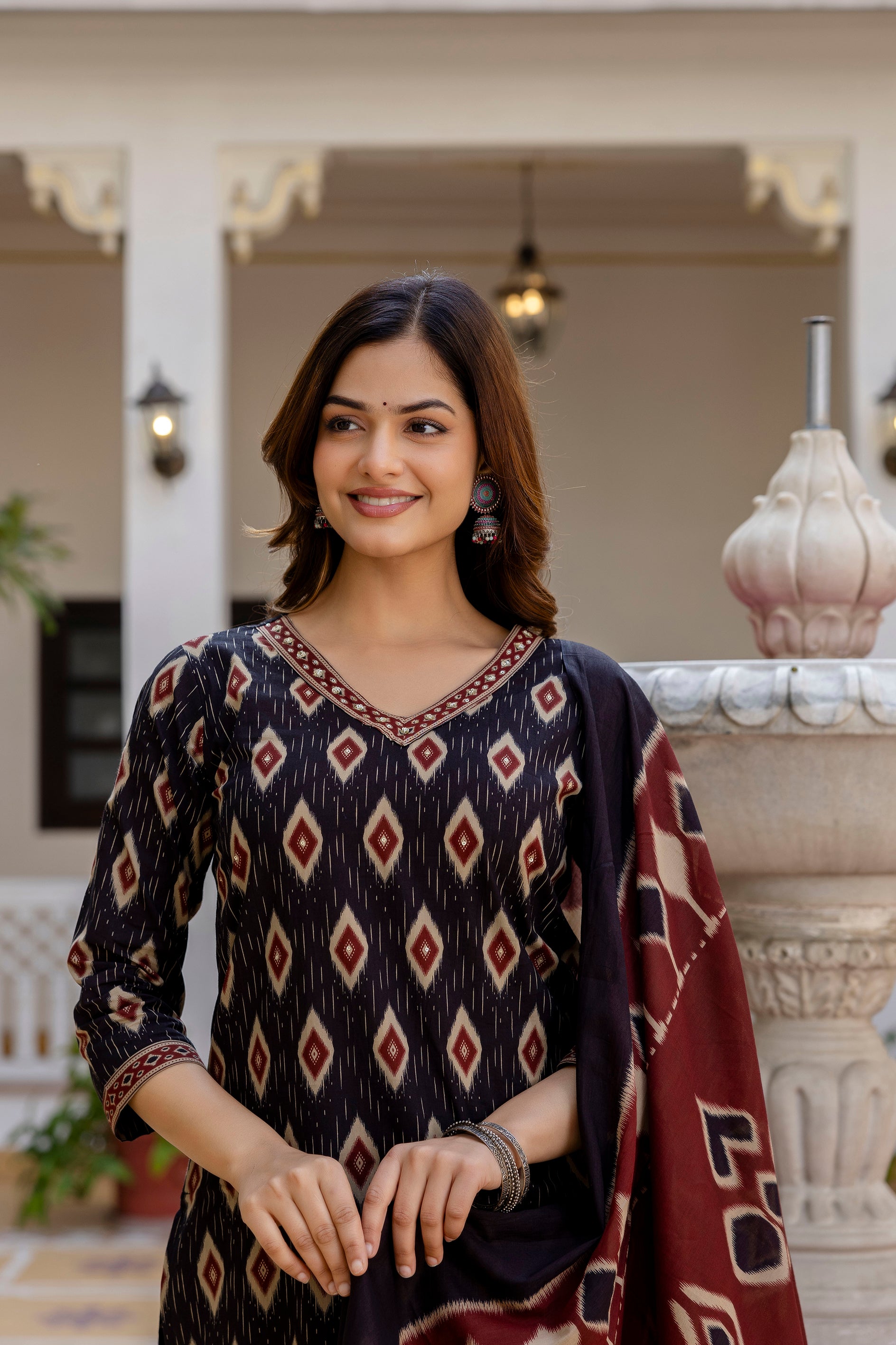 A classic geometric Ikat printed straight kurta paired with printed trousers and a matching printed dupatta—crafted in pure cotton for breathable comfort and elegant everyday wear.