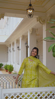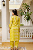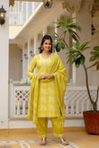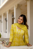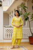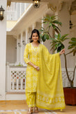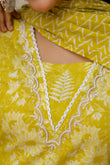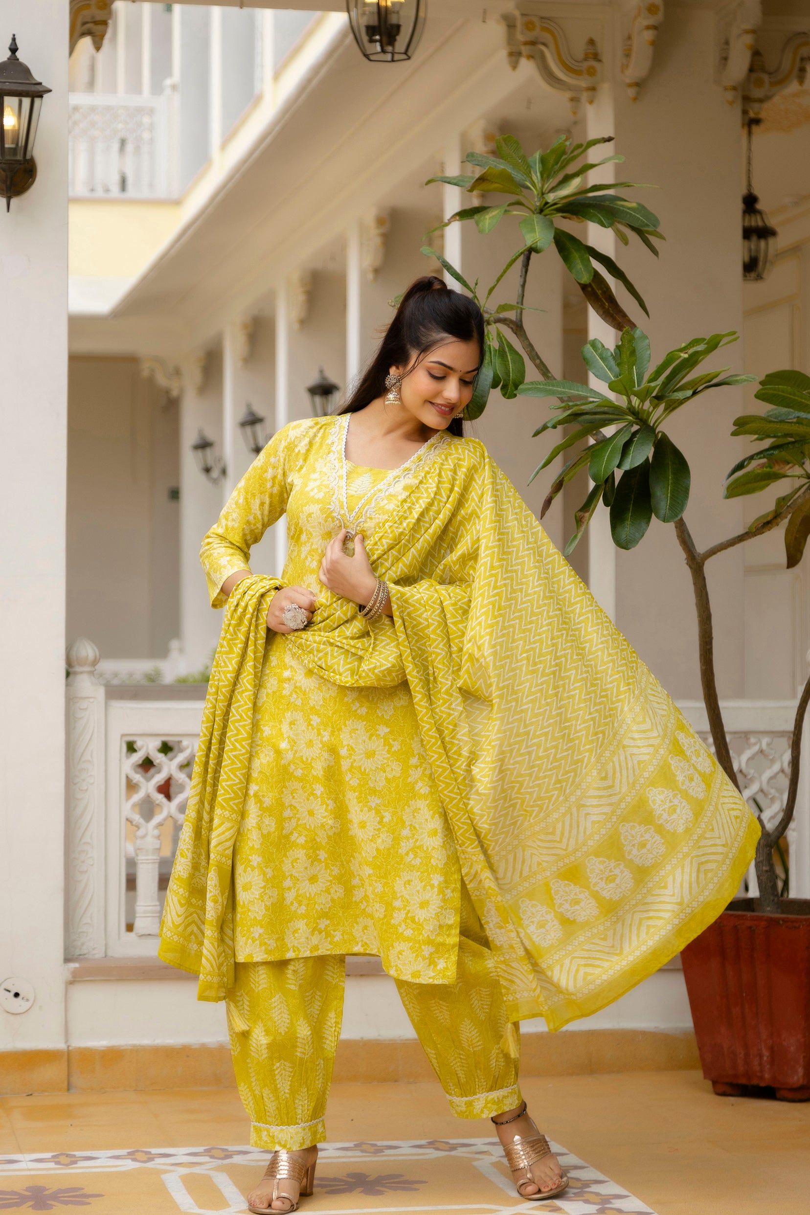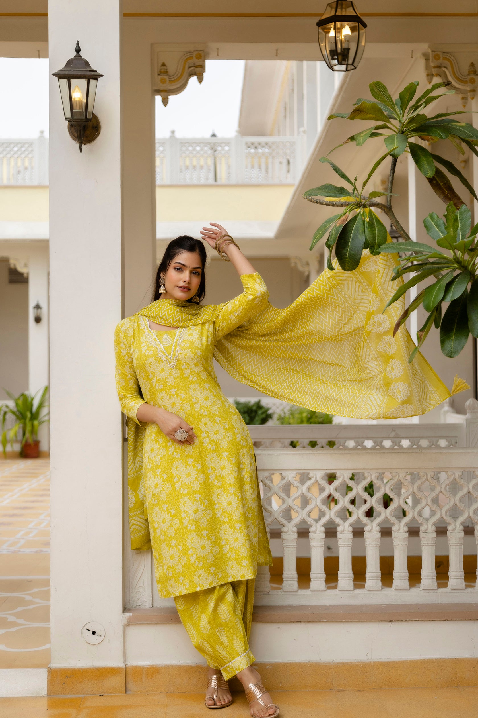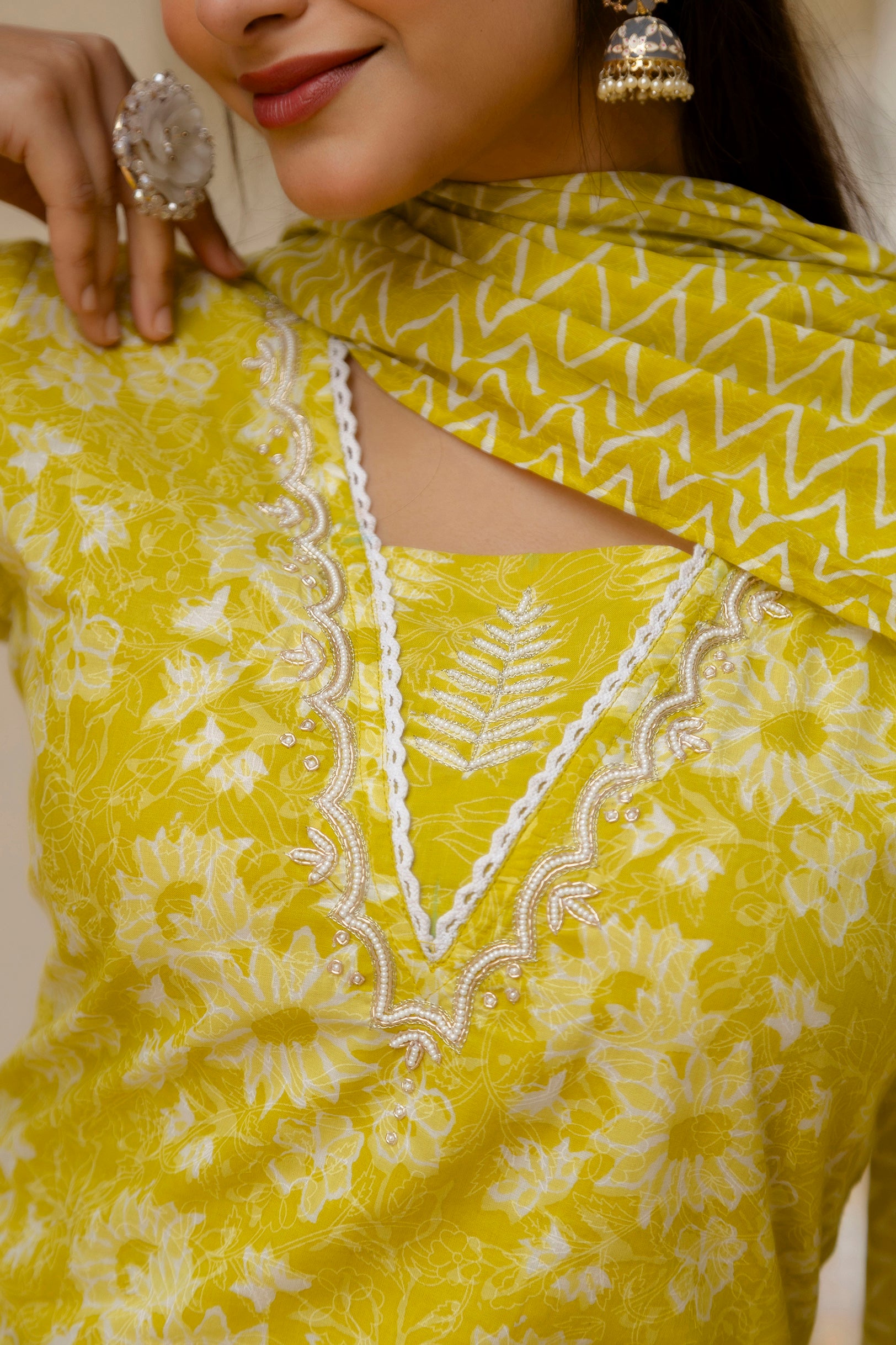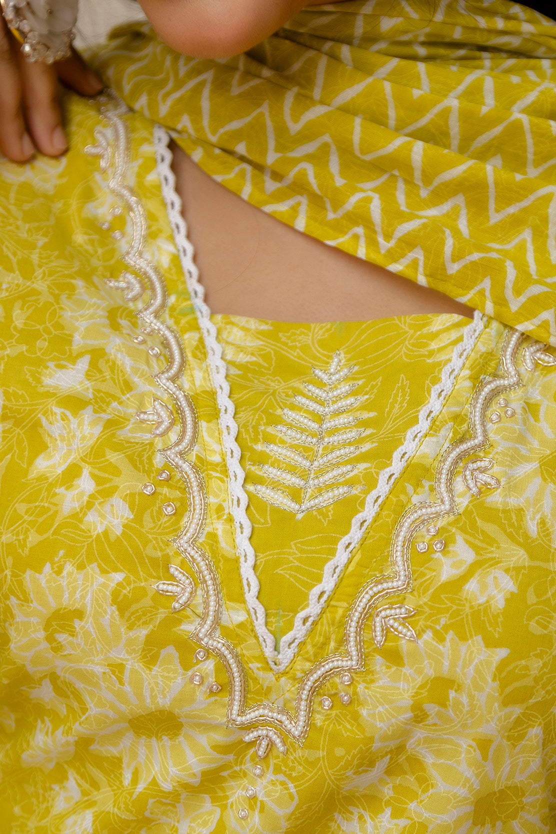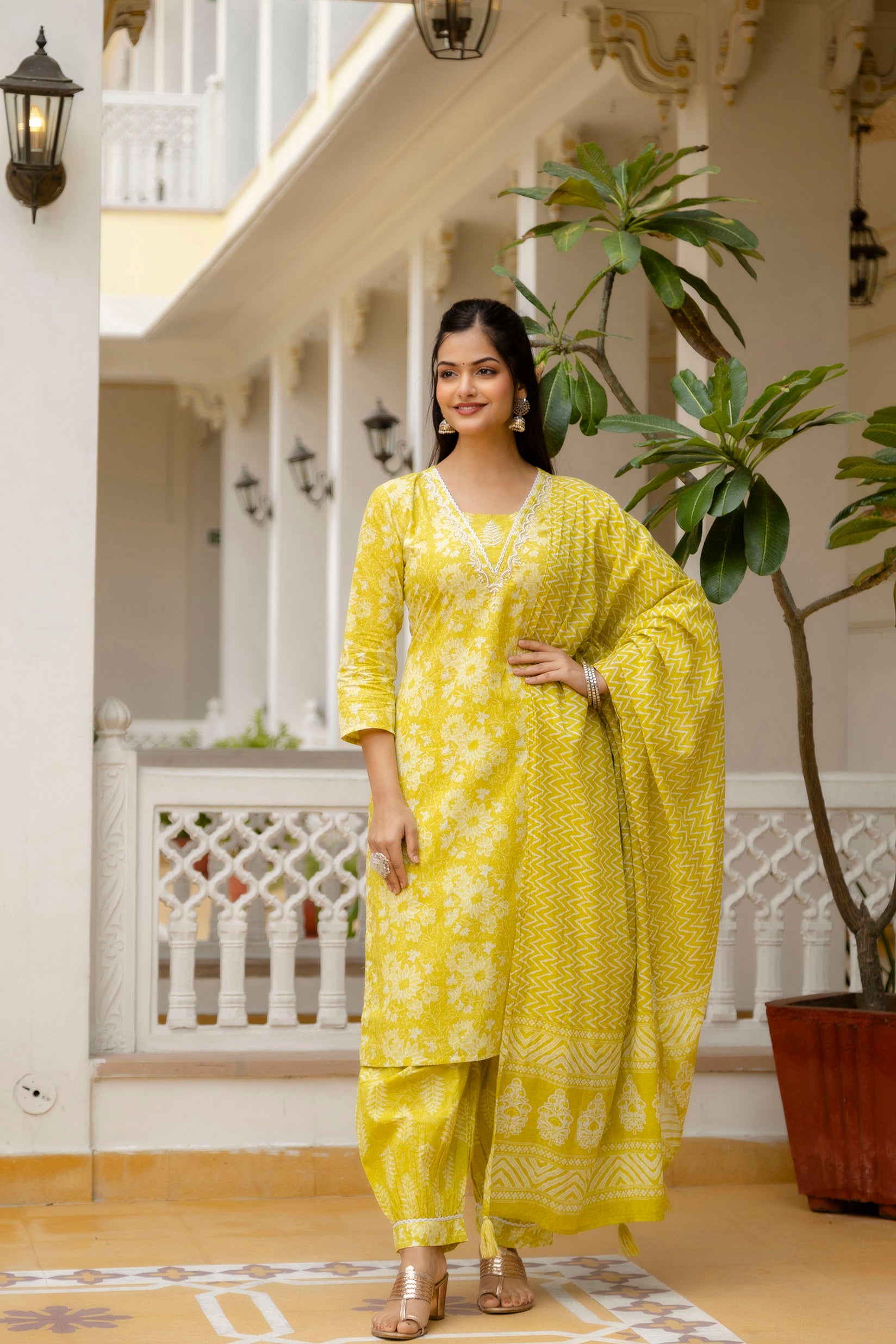 A charming yellow floral yoke kurta set with printed Patiala and matching dupatta, crafted in breathable pure cotton for all–day comfort.
